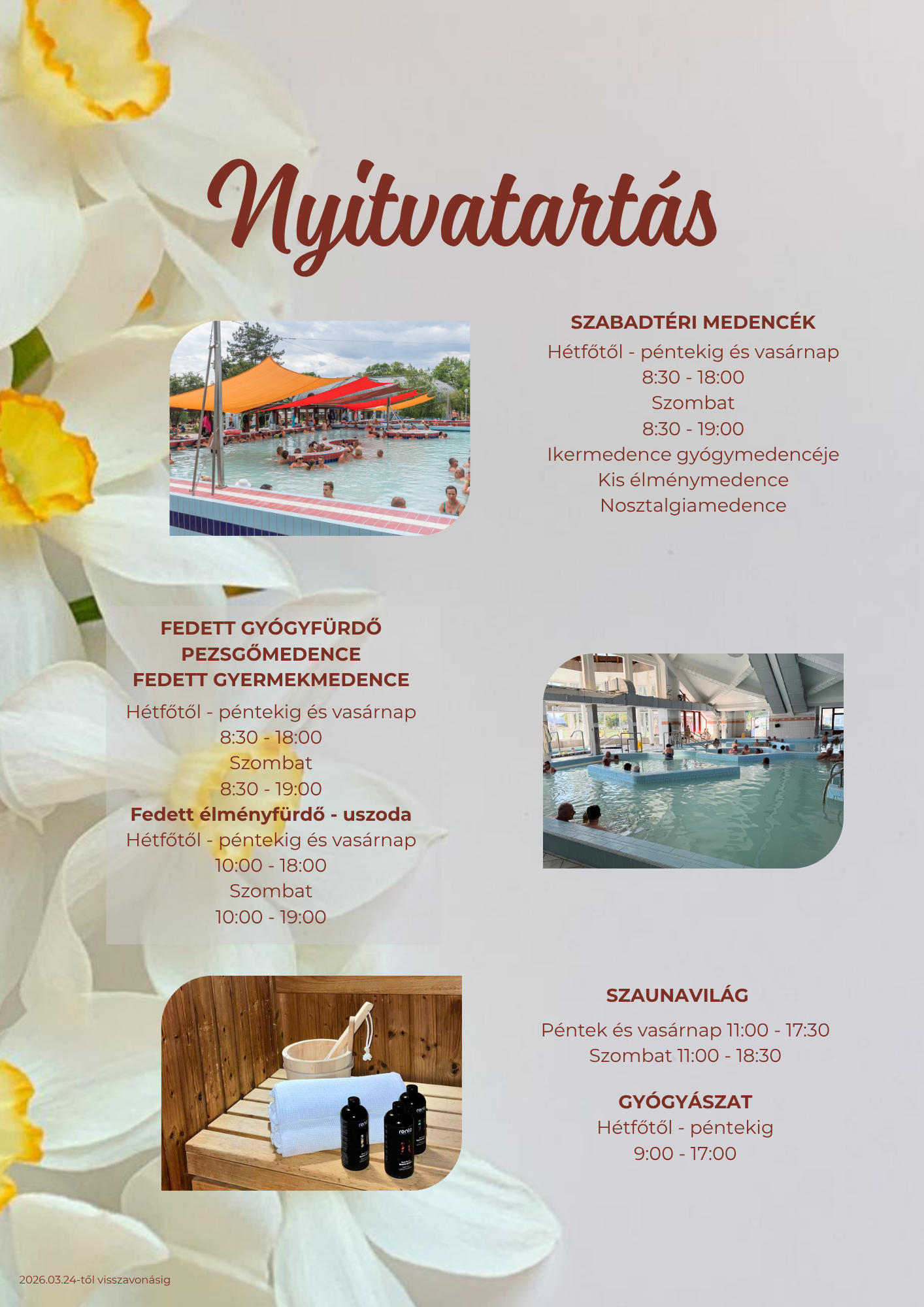 Tájékoztatjuk Kedves Vendégeinket, hogy 2026.03.24-től visszavonásig a fürdő nyitvatartása az alábbiak szerint változik: